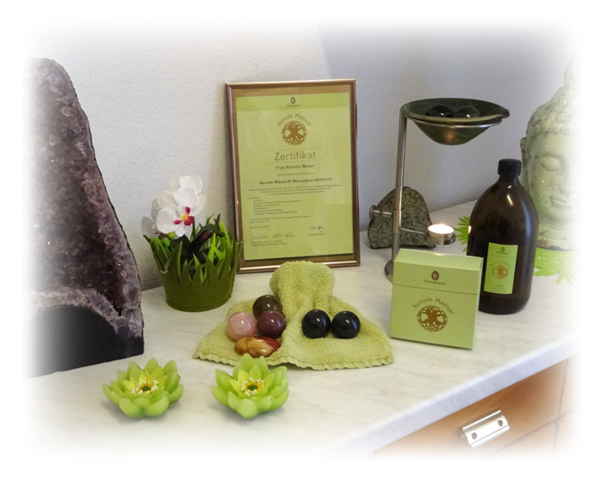 Die Aurum Manus® Massage ist eine Wellness-Massage. Sie enthält Elemente der Chinesischen Heilkunst, klassische Massage, Akupressur, Fußreflexzonen-Massage, Gesichtsmassage, unter Verwendung einer individuellen Mischung warmen ätherischen Öl nach Hildegard von Bingen. Mit Edelsteinen (Nephrit, Bergkristall, Mookait) werden die Meridianbahnen abgefahren.